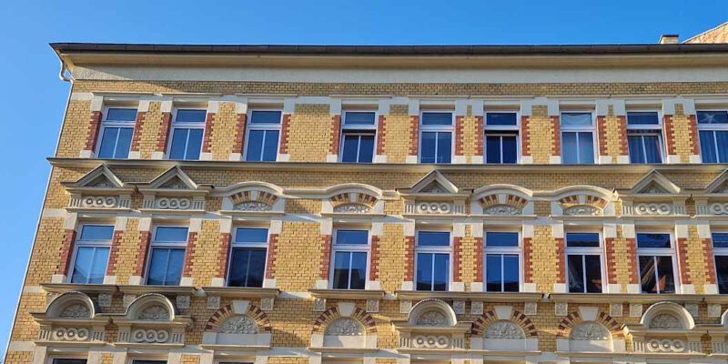 Mehrfamilienhäuser aus der Zeit um 1900–1920 mit massiven Ziegelmauern und originalgetreuen Fassaden unterliegen oft dem Denkmalschutz. Daher wurde bei Sanierungen in den 1990er Jahren typischerweise auf Fassadendämmung verzichtet. Durchgeführt wurden Maßnahmen wie Dachdämmung und der Fensteraustausch. Das führte zu U-Werten von 0,8–1,2 W/m²K an Außenwänden. Die Heizlast liegt dann meist zwischen 80–120 W/m². Wärmepumpen können auch hier eingesetzt werden.